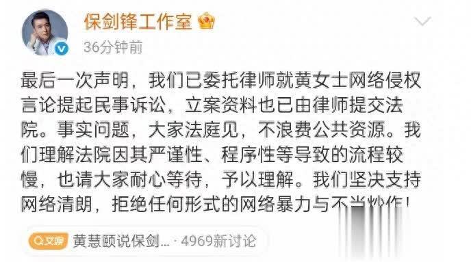 面对黄慧颐的连环爆料,保剑锋方面的回应相当强硬。2025年底至今,工作室三次发布声明,全盘否认出轨、隐婚、感情重叠等所有指控