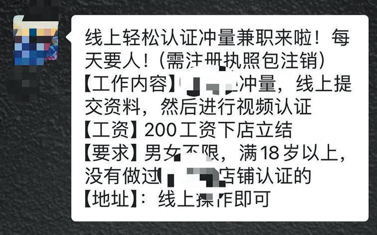 大学入学后,郑运昌加入校园内部的兼职群。某天,一则兼职信息吸引了他的注意:某大型电商企业冲量,线上提交资料,然后进行视频认证,200元工资立结。