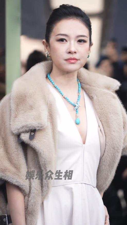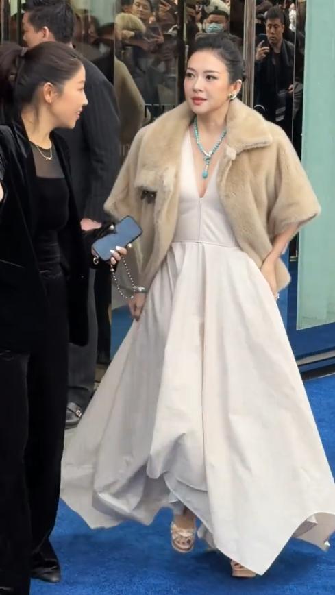 章子怡当天身穿一条白色深V长裙,大露事业线,气质端庄又大气,外面还披了一件米色毛毛外套,贵气十足,瞬间碾压全场。