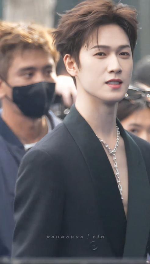 和唐嫣形成鲜明对比的,是李昀锐,他当天身穿一身黑色深V西装,内搭真空,显得既矜贵又有张力。